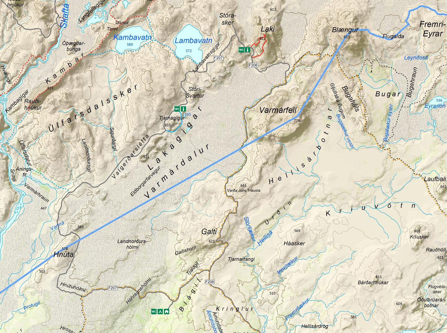 Der er 30 bumplende kilometer og 3-5 mindre flodkrydsninger fra starten af vej F206 og ind til starten af Laki Nationalpark. Ved foden af Mt Laki ligger et helt nyt toilethus med borde og bænke, hvor man kan spise sin medbragte mad. Der er også en vandhane med dejligt koldt islandsk drikkevand.